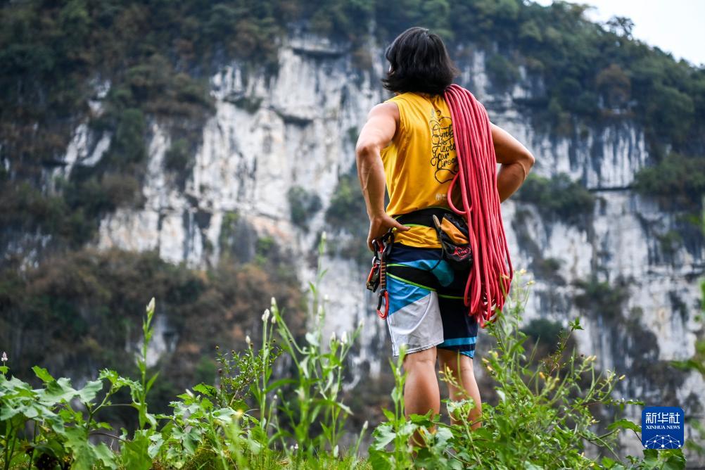 劉永邦準備進(jìn)行野外攀巖(2022年9月9日攝)。