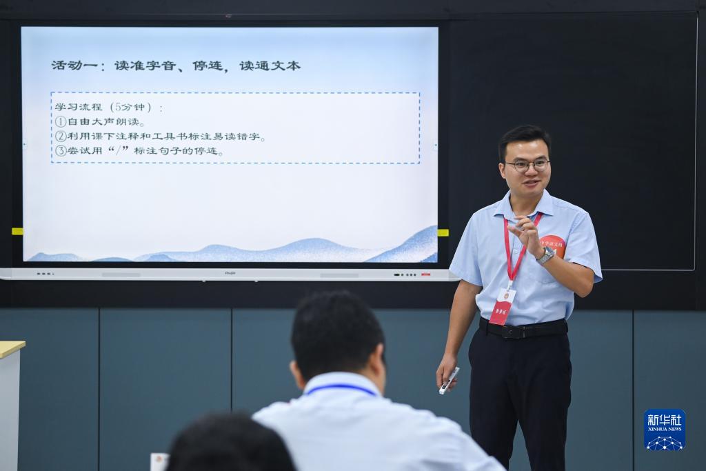 8月22日,中學(xué)語(yǔ)文組的一名教師在進(jìn)行教學(xué)展示。