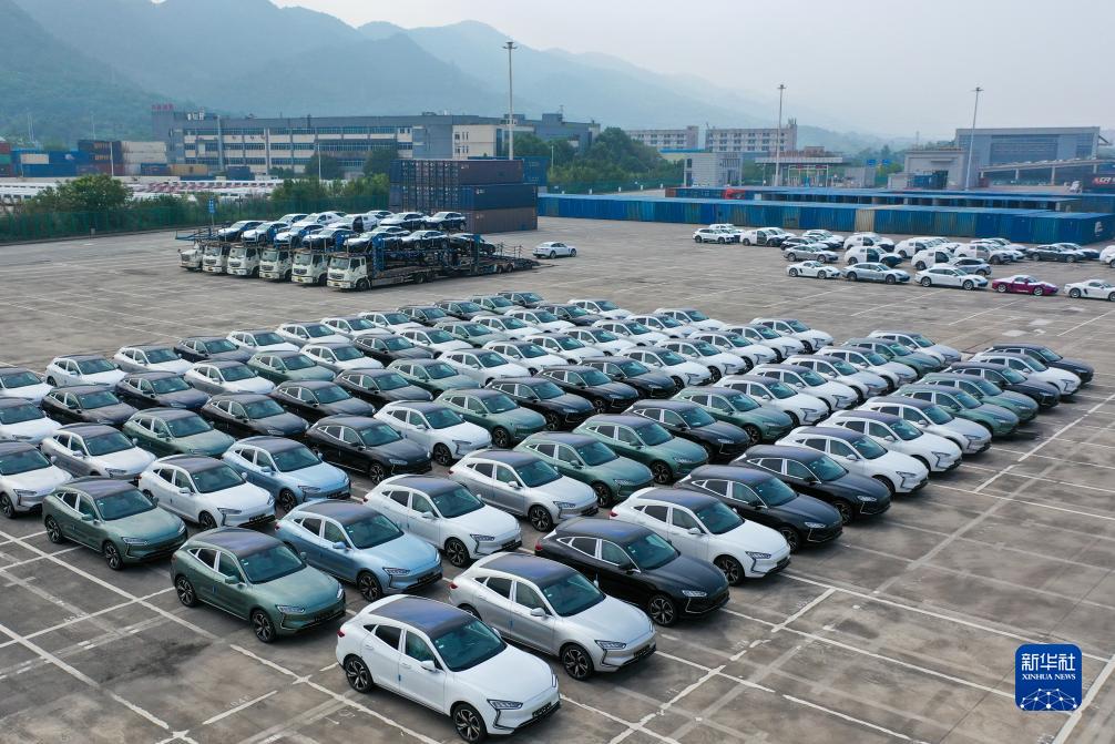 車(chē)輛在位于重慶市沙坪壩區的重慶鐵路口岸等待完成檢驗(8月22日攝,無(wú)人機照片)。