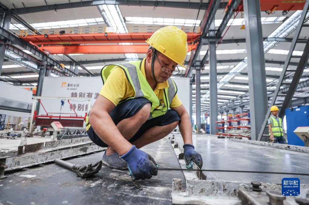 8月22日,海南定安縣新竹鎮華潤智筑科技(定安)裝配式示范產(chǎn)業(yè)基地工人在布置模具。
