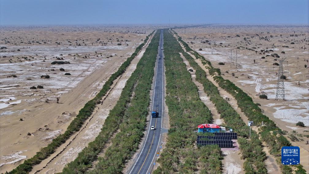 在位于新疆的塔克拉瑪干沙漠腹地,中國首條貫穿塔克拉瑪干沙漠的等級公路——塔里木零碳沙漠公路,像一條綠色長(cháng)龍蜿蜒曲折,在沙漠深處延伸。