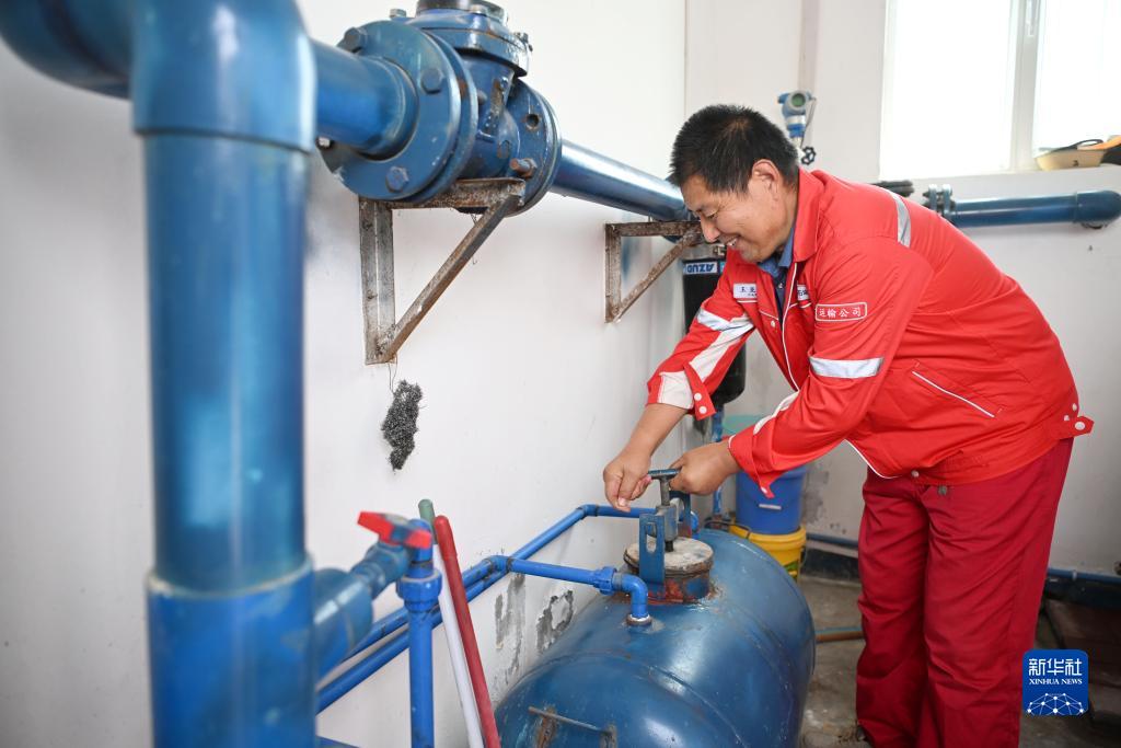 中國石油塔里木油田沙漠公路零碳示范工程管護員王亞斌在管護站調試灌溉設備(8月20日攝)。