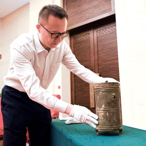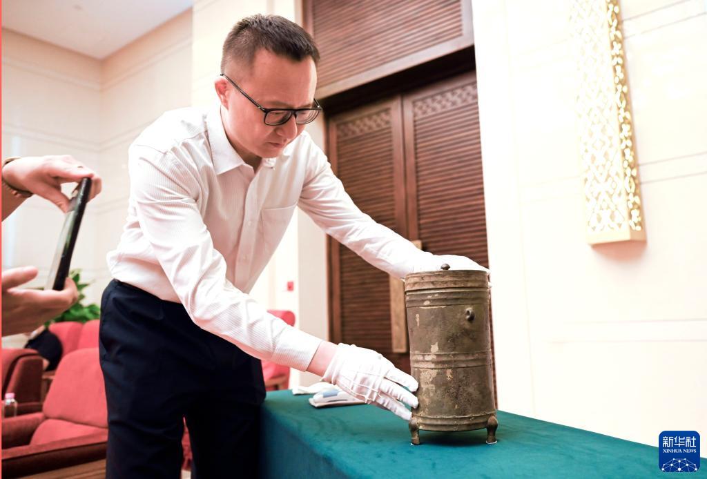 當日,中國國家博物館舉行西漢河平元年銅鋞入藏儀式。鋞(音同“形”)為出門(mén)攜帶使用的盛酒器或盛食器。此次國家博物館入藏的銅鋞高29.5厘米,直徑12.8厘米,器身外壁有銘文31字,其中“河平元年供工昌造銅鋞”的文字內容,是其斷代的重要依據。該銅鋞由熱心公益文化事業(yè)的童琳高、王超兩人在國內拍賣(mài)市場(chǎng)購得,隨后聯(lián)合捐贈給中國國家博物館。