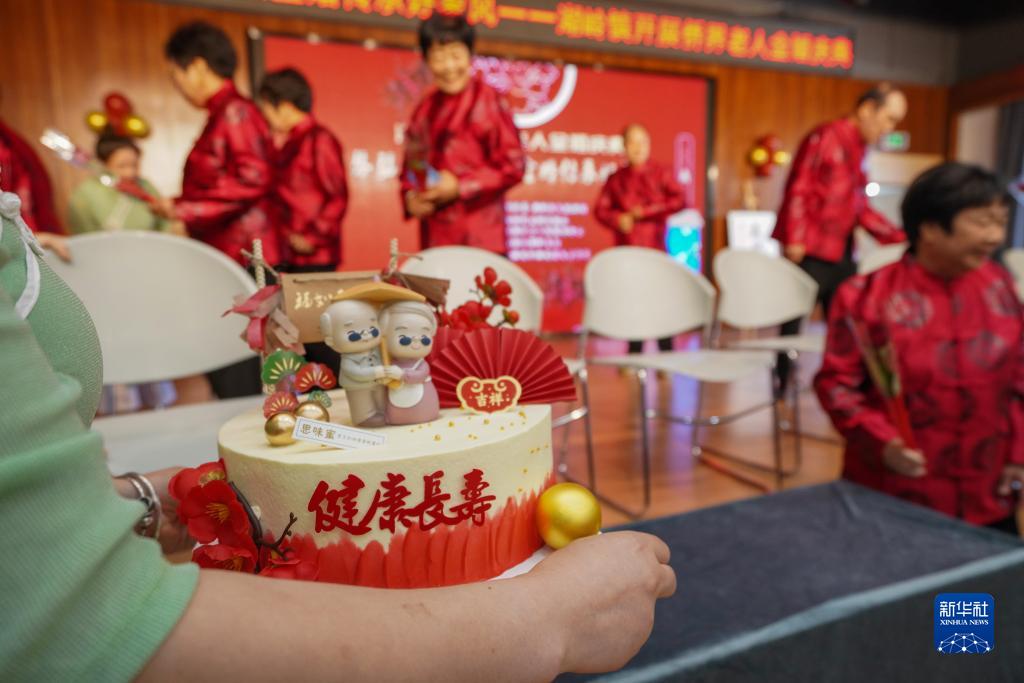 8月22日,在浙江省瑞安市湖嶺鎮綜合文化站,工作人員為金婚夫婦送上蛋糕。