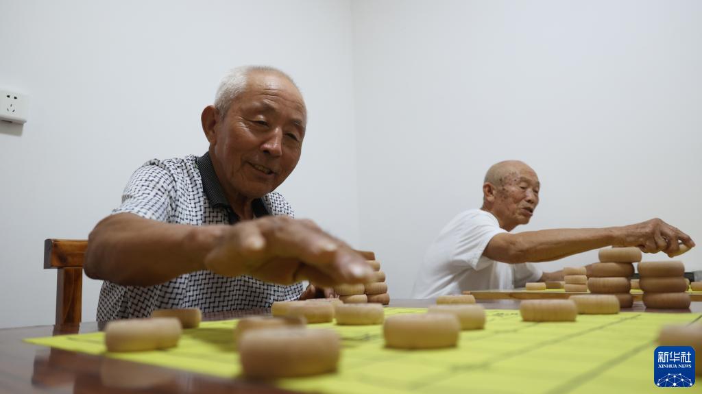 8月22日,老人在青縣曹寺鎮曹寺村的孝老食堂與志愿者下象棋。