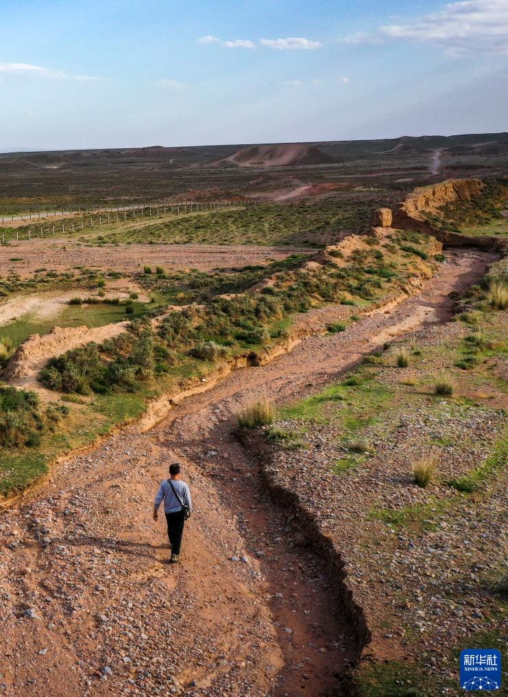 8月20日,董海寧徒步巡查賀蘭山沿線(xiàn)的明長(cháng)城永寧段(無(wú)人機照片)。
