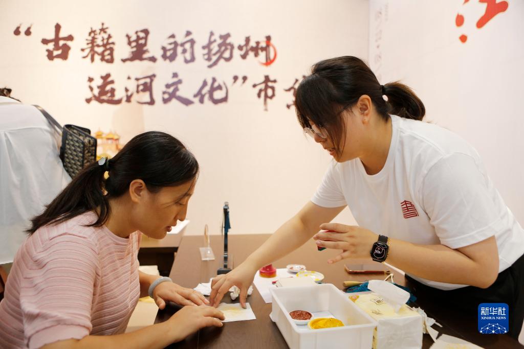 8月22日,市民在揚州市圖書(shū)館“古籍里的揚州運河文化”市集參觀(guān)、體驗。