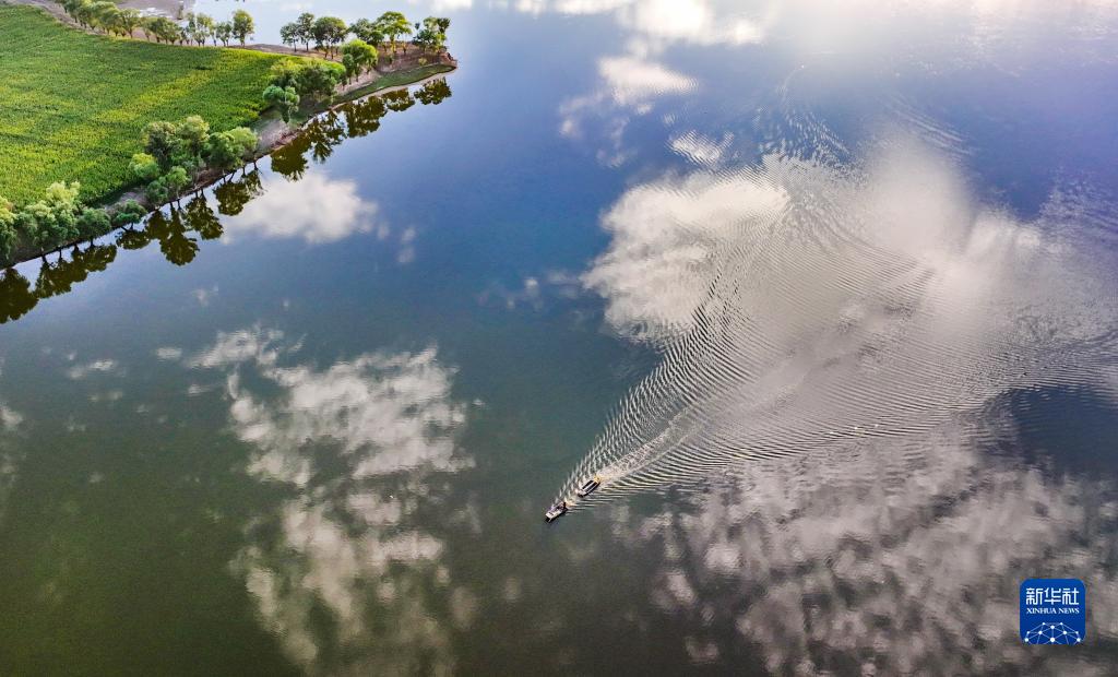 兩條小船行駛在蘆河河面上,宛如一幅壯麗的圖畫(huà)(8月18日攝,無(wú)人機照片)。