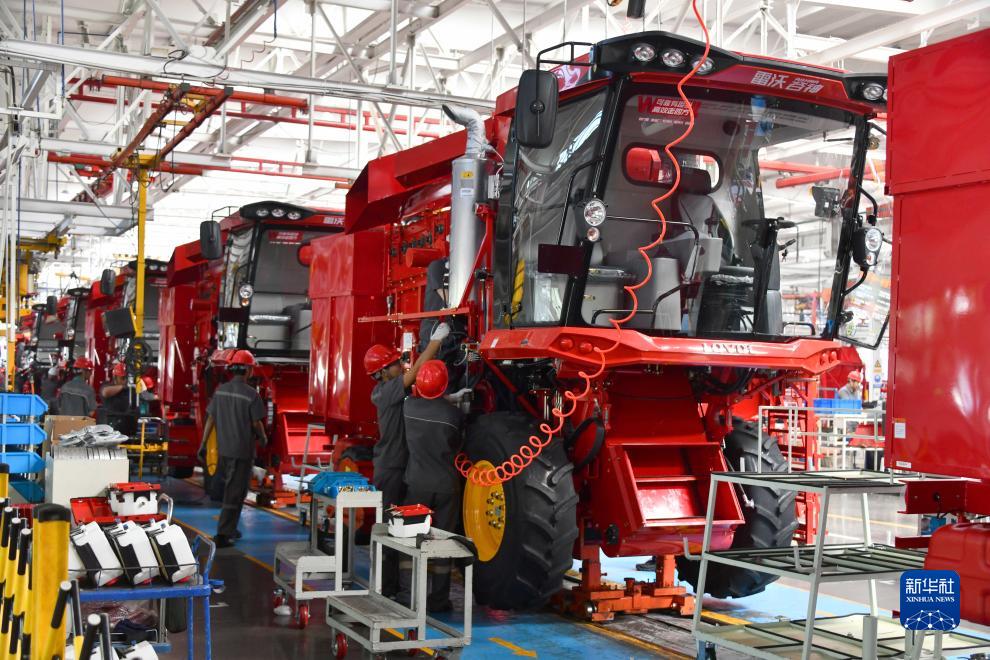 8月22日,在位于山東省濰坊市坊子區的濰柴雷沃智慧農業(yè)科技股份有限公司,工人在車(chē)間組裝生產(chǎn)大型農機設備。