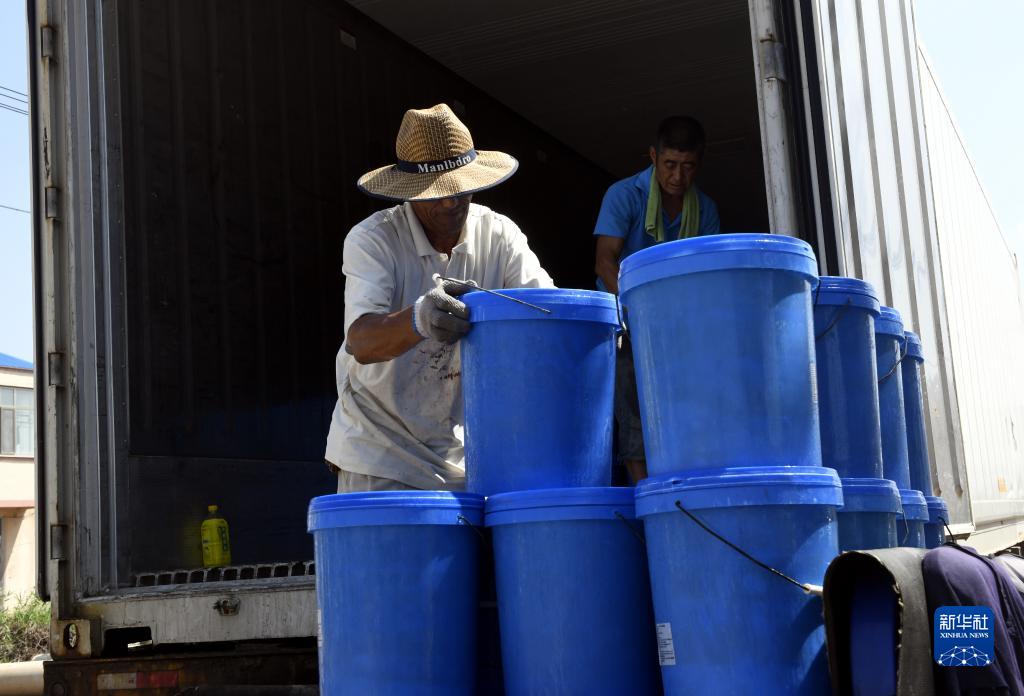 8月22日,在山東省濱州市沾化區馮家鎮一家海蜇加工廠(chǎng),工人在裝卸來(lái)自馬來(lái)西亞的海蜇。