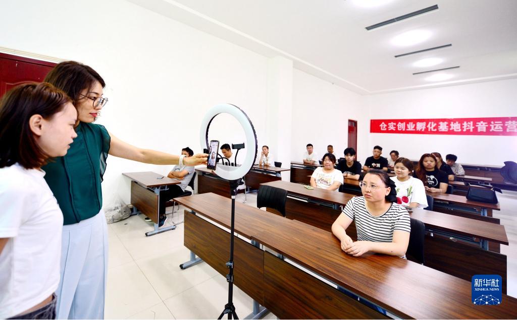 8月23日,學(xué)員(左一)在電商直播培訓班上學(xué)習直播技巧。