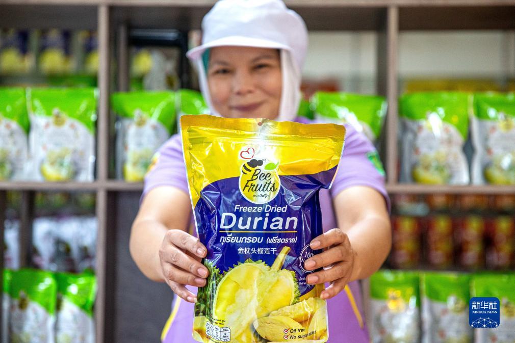 8月17日,在泰國尖竹汶府,尖竹汶果品公司工作人員展示榴蓮干產(chǎn)品。新華社記者 王騰 攝