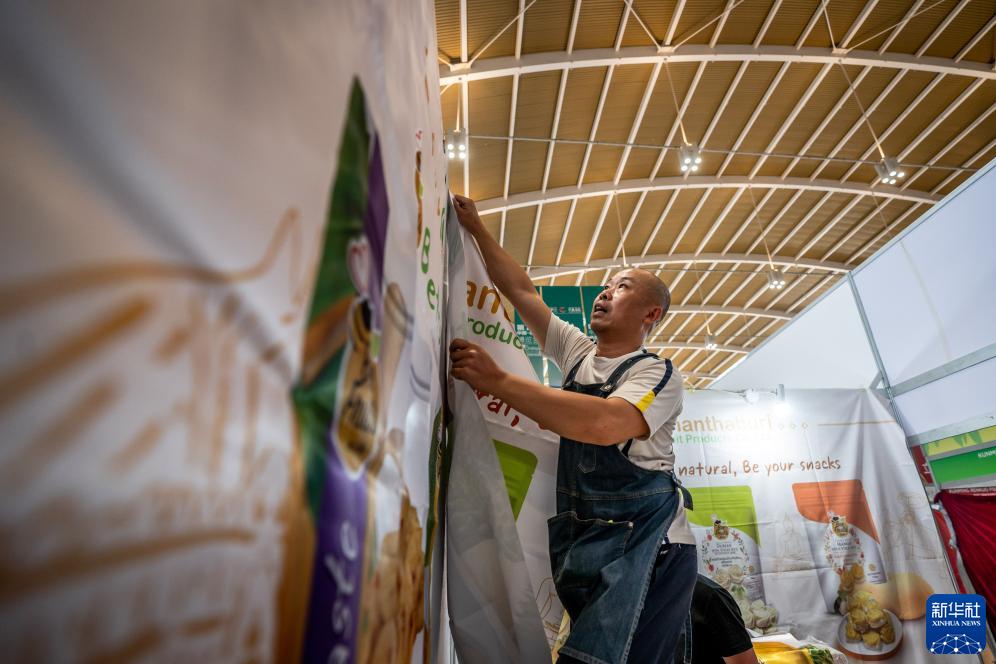 8月14日,泰國華商陳杰在南博會(huì )開(kāi)幕前布置展區。新華社記者 胡超 攝
