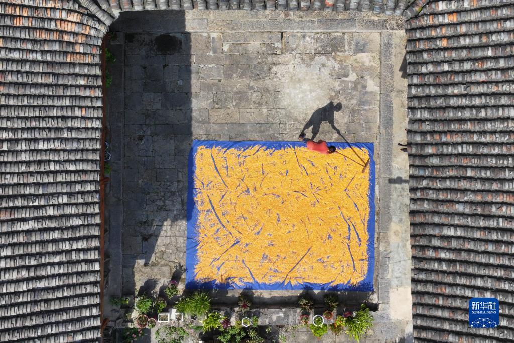8月23日,貴州省黔東南苗族侗族自治州岑鞏縣注溪鎮衙院村村民在晾曬玉米(無(wú)人機照片)。