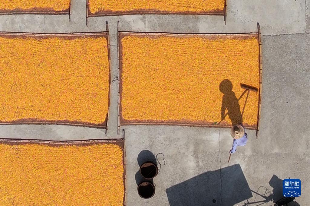 8月23日,貴州省黔東南苗族侗族自治州岑鞏縣注溪鎮衙院村村民在晾曬玉米(無(wú)人機照片)。