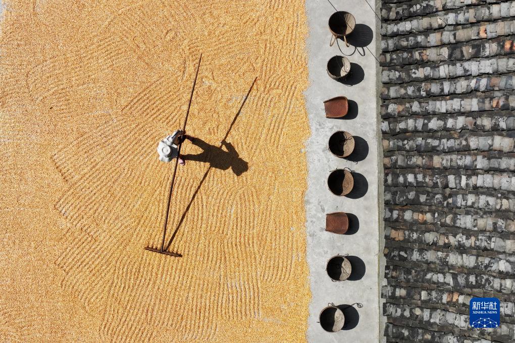 8月23日,重慶市黔江區沙壩鎮三臺村村民在晾曬玉米(無(wú)人機照片)。