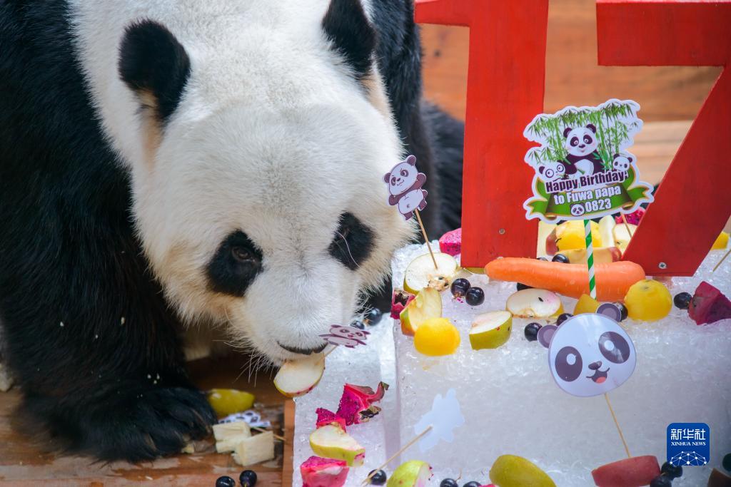 在馬來(lái)西亞國家動(dòng)物園大熊貓保護中心內,中國旅馬大熊貓夫婦“興興”和“靚靚”23日迎來(lái)了17歲生日。