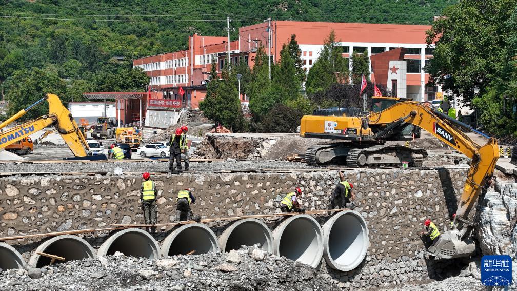 8月23日,在北京市房山區霞云嶺中心小學(xué),北京建工機施集團的施工人員在搶建供學(xué)校與外界通行的新橋梁(無(wú)人機照片)。