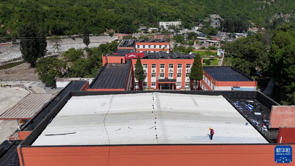 8月23日,在北京市房山區霞云嶺中心小學(xué),北京建工裝飾集團的施工人員在屋頂刷防水涂料(無(wú)人機照片)。