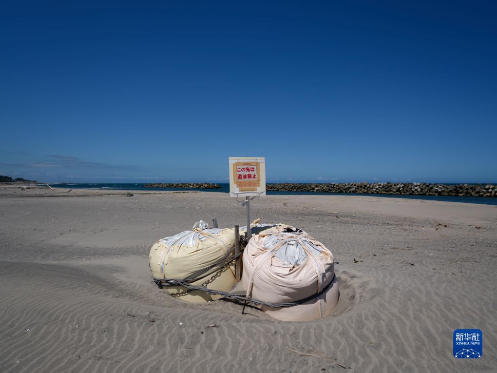這是8月22日在日本福島縣相馬郡新地町釣師浜海水浴場(chǎng)拍攝的“禁止游泳”的告示牌。新華社記者 張笑宇 攝