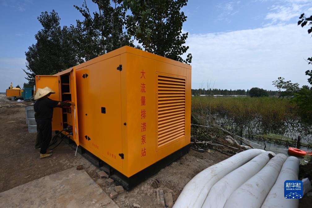 8月24日,工作人員在天津市靜海區大清河南堤抽水現場(chǎng)檢查抽水泵工作狀態(tài)。