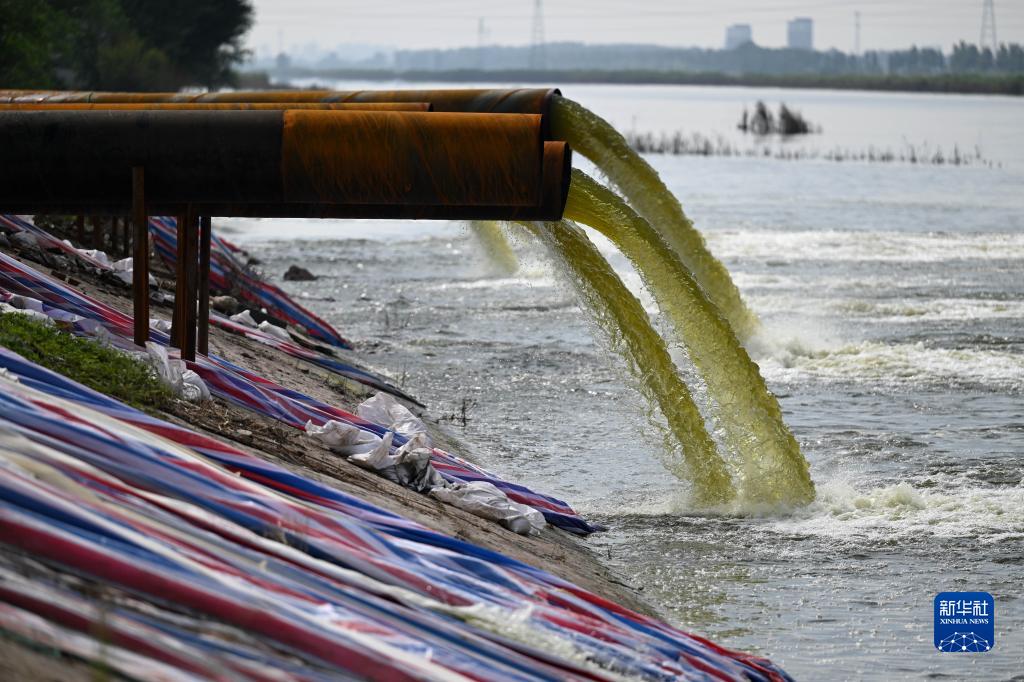 8月24日,大型抽水泵將天津市靜海區王口鎮茁頭排干渠西側農田內的積水抽排到大清河河道內。