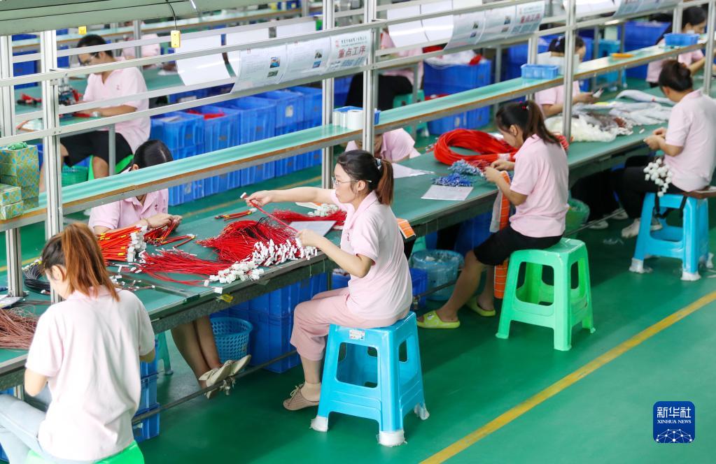 8月24日,四川省廣安華鎣山經(jīng)開(kāi)區一家電子企業(yè)的線(xiàn)束車(chē)間,員工在流水線(xiàn)上作業(yè)。