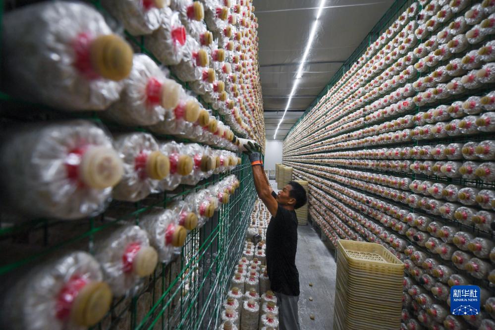 8月24日,在連云港市灌南縣一家食用菌企業(yè),工作人員在生產(chǎn)車(chē)間整理菌包。