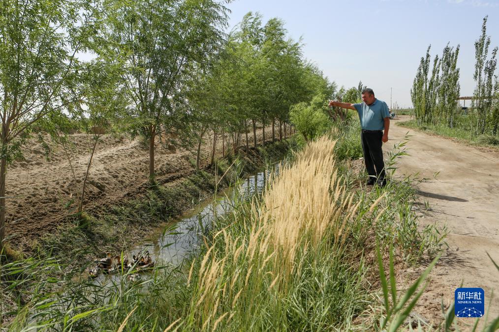 8月17日,爾肯·熱衣木在棉田附近的水渠旁呼趕鴨子上岸,以清點(diǎn)鴨子的數量。
