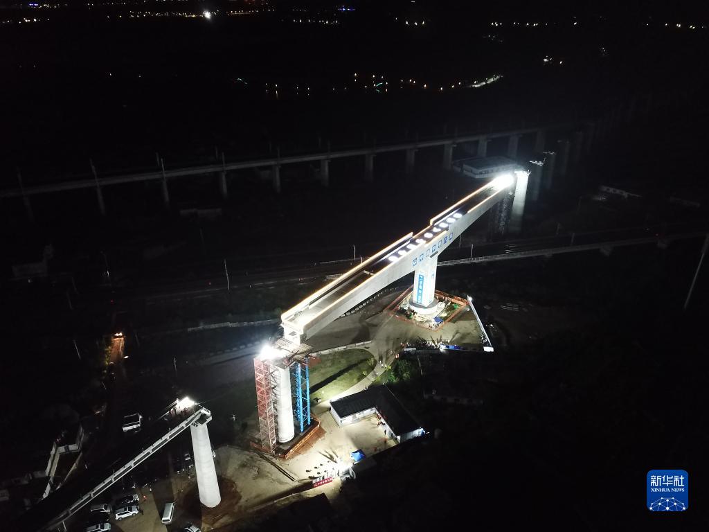 正在轉體中的尖坡寨特大橋(無(wú)人機照片,8月25日攝)。