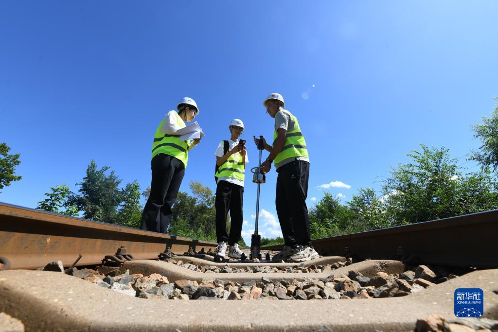 在黑龍江省雙鴨山市集賢縣的鐵路沿線(xiàn),部分勘察班組成員在鐵路既有線(xiàn)開(kāi)展路基狀態(tài)檢測作業(yè)(8月24日攝)。