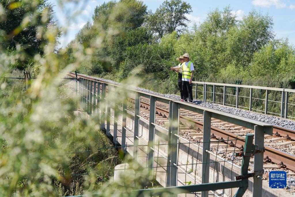 在黑龍江省雙鴨山市集賢縣的鐵路沿線(xiàn),勘察班組成員田澤敏(右)與胡道寧在鐵路既有線(xiàn)開(kāi)展調查作業(yè)(8月24日攝)。