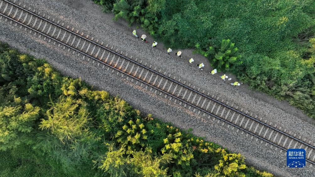 8月24日,在黑龍江省雙鴨山市集賢縣的鐵路沿線(xiàn),勘察班組成員在鐵路既有線(xiàn)開(kāi)展調查作業(yè)(無(wú)人機照片)。