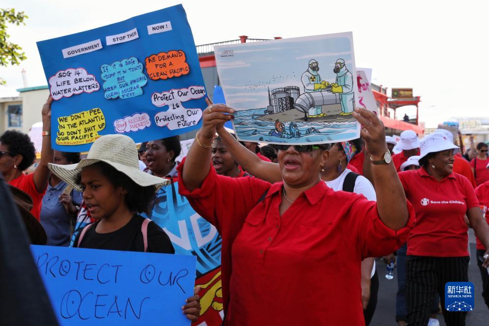 當日,數百名斐濟民眾沿街游行,強烈抗議日本政府啟動(dòng)福島第一核電站核污染水排海,呼吁國際社會(huì )采取行動(dòng)保護太平洋生態(tài)和子孫后代的福祉。