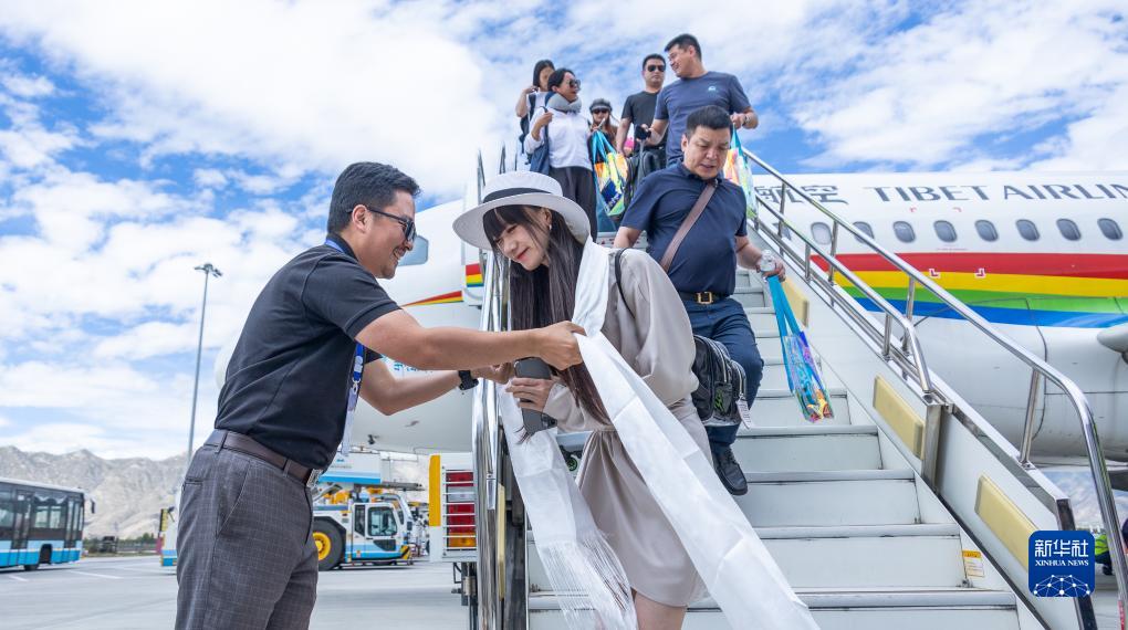 在西藏航空“地球第三極號”飛機首航儀式現場(chǎng),工作人員為游客獻上哈達(8月25日攝)。新華社發(fā)(丁增尼達攝)
