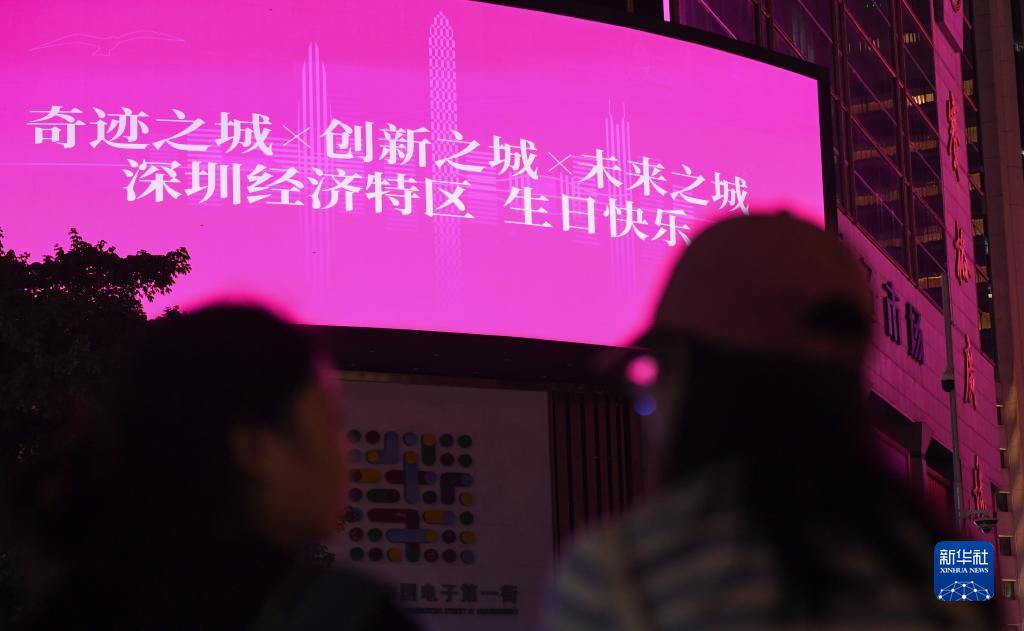 8月25日,兩位市民在深圳華強北觀(guān)看為深圳慶生的廣告牌。新華社記者 毛思倩 攝