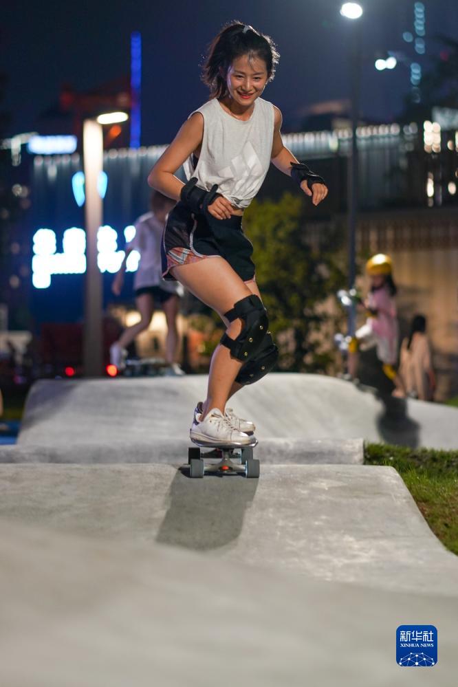 市民在南京市建鄴區西城·夜未央運動(dòng)街區滑滑板(8月25日攝)。