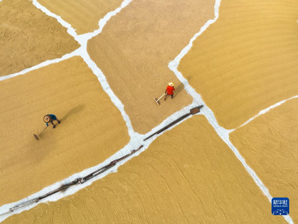 8月26日,在湖南省衡陽(yáng)市常寧市廟前鎮泉井村,村民在晾曬稻谷(無(wú)人機照片)。