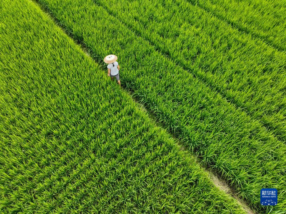 8月26日,在湖南省永州市道縣萬(wàn)家莊街道五洲社區,農民在查看晚稻長(cháng)勢(無(wú)人機照片)。