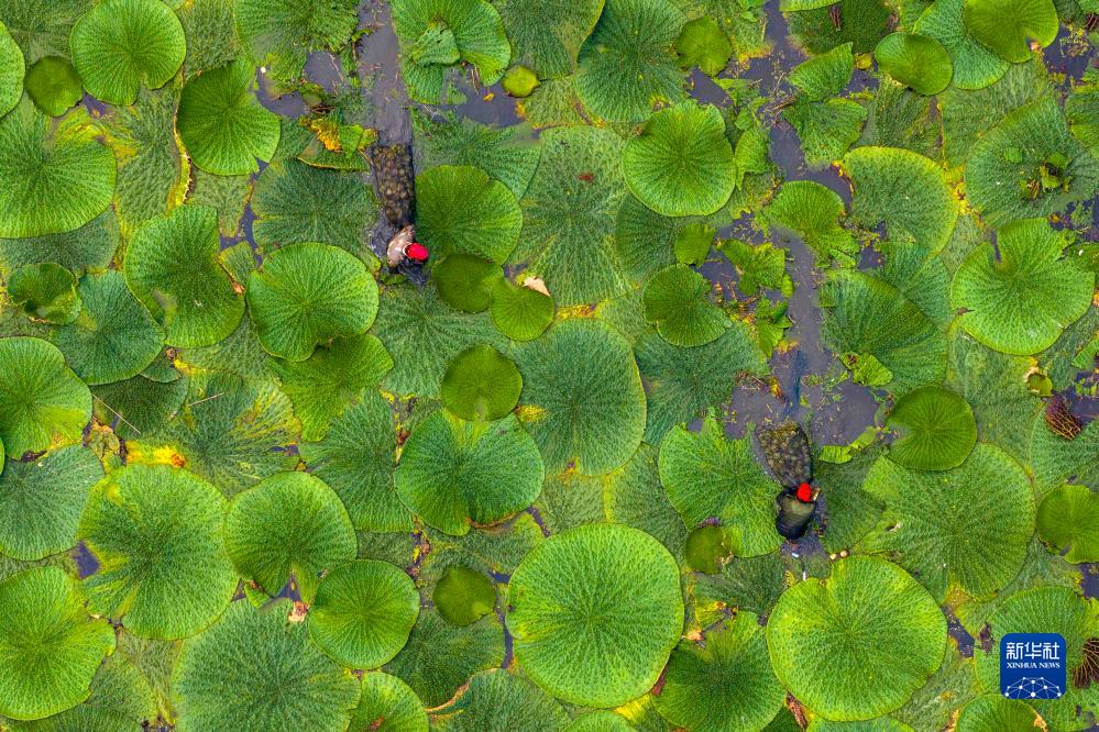 8月26日,江蘇省泰州市姜堰區顧高鎮申俞村農民在采收芡實(shí)(無(wú)人機照片)。