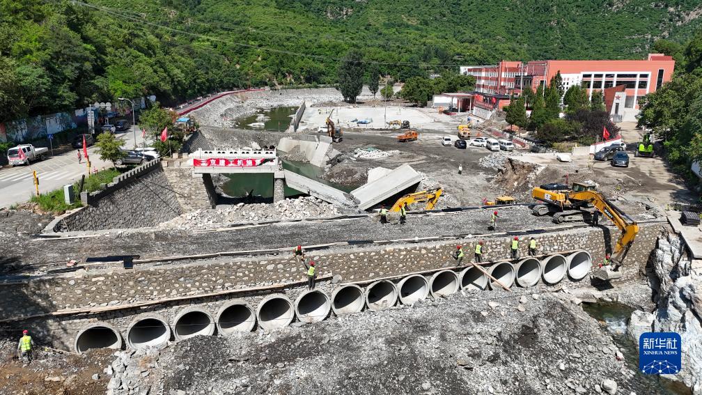8月23日,在北京市房山區霞云嶺中心小學(xué),北京建工機施集團的施工人員在搶建供學(xué)校與外界通行的新橋梁(無(wú)人機照片)。