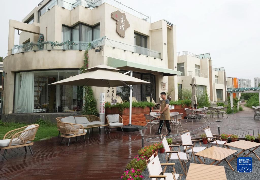 8月26日,秦皇島市海港區中瑞設計港內一家休閑咖啡書(shū)吧的工作人員在清洗院落內的地板。