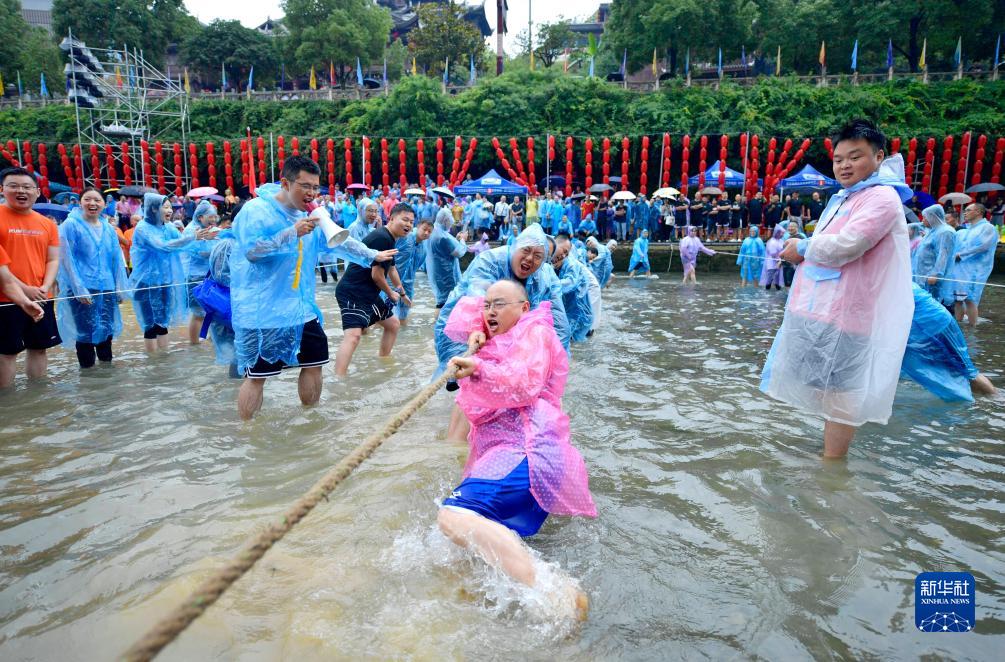 當日,在湖北省恩施土家族苗族自治州宣恩縣仙山貢水旅游區的貢水河中,近千名居民和游客組成60余支拔河隊在河中開(kāi)展趣味拔河比賽,感受快樂(lè )與清涼。