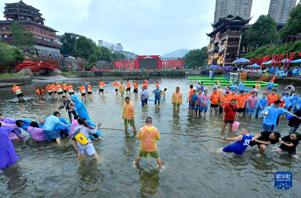 當日,在湖北省恩施土家族苗族自治州宣恩縣仙山貢水旅游區的貢水河中,近千名居民和游客組成60余支拔河隊在河中開(kāi)展趣味拔河比賽,感受快樂(lè )與清涼。