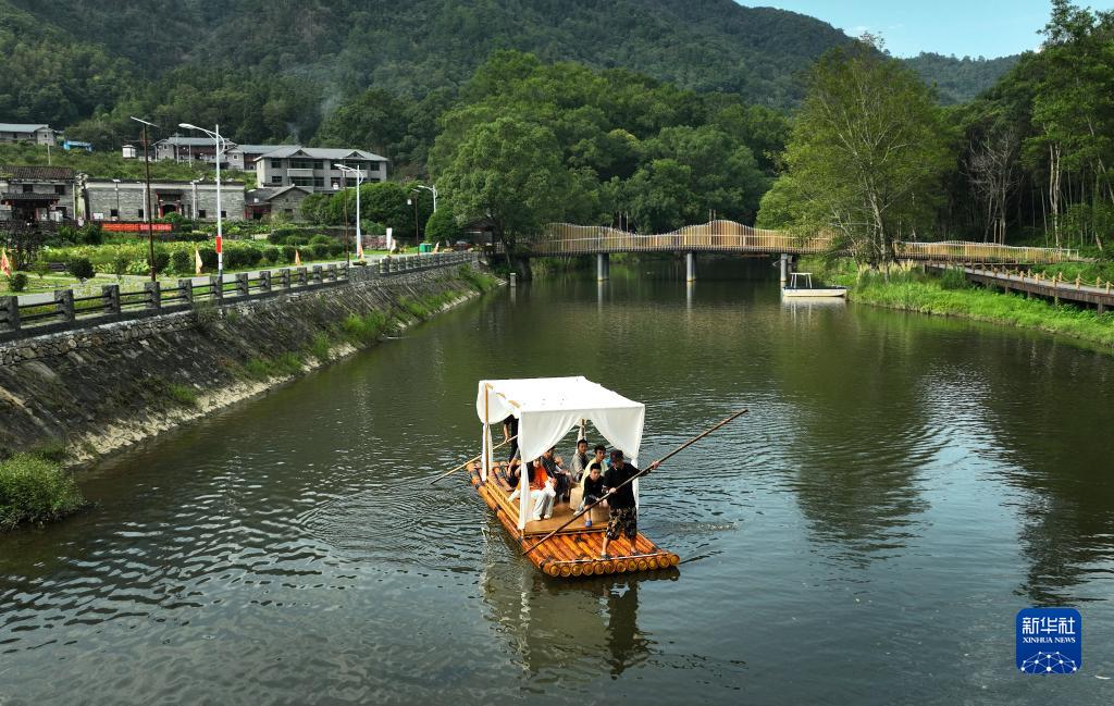 游客在港背村的小溪里體驗竹筏漂流(8月24日攝,無(wú)人機照片)。