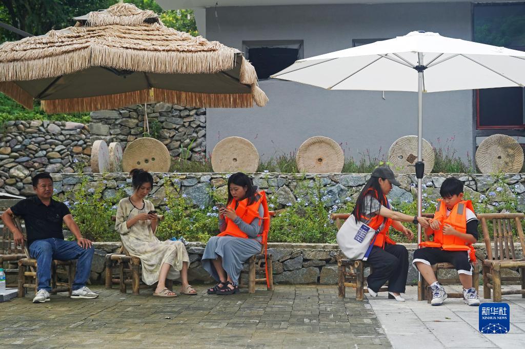 游客在碼頭休息區等待體驗竹筏漂流(8月24日攝)。