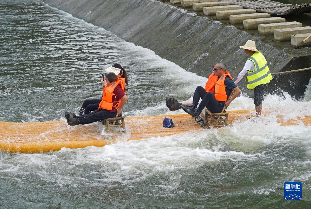 游客在港背村的小溪里體驗竹筏漂流(8月24日攝)。