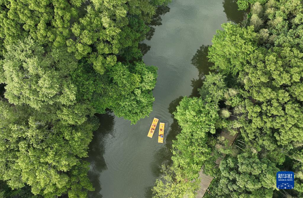 游客在港背村的小溪里體驗竹筏漂流(8月24日攝,無(wú)人機照片)。