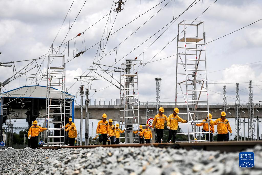 8月27日,中國鐵路南寧局集團有限公司南寧供電段的接觸網(wǎng)工在南寧第二動(dòng)車(chē)所存車(chē)線(xiàn)內步行前往作業(yè)地點(diǎn)。