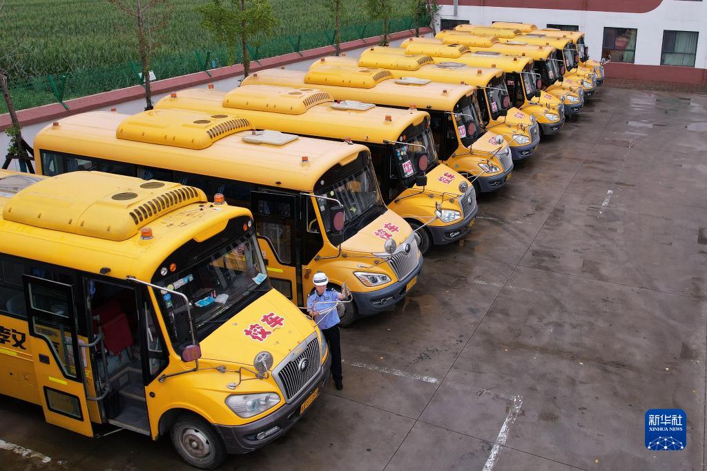 8月27日,石家莊市公安局藁城分局交通警察大隊輔警在天鶴教育集團對校車(chē)進(jìn)行安全檢查(無(wú)人機照片)。